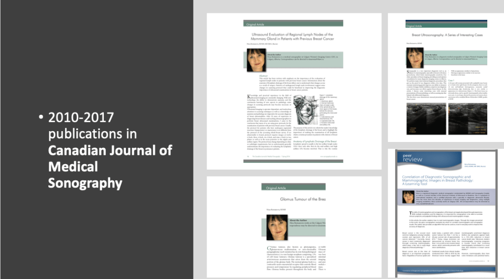 2010-2022 автор ряда публикаций по теме УЗД патологии МЖ в канадском журнале Ультразвуковой Диагностики. Canadian Journal of Medical Sonography.