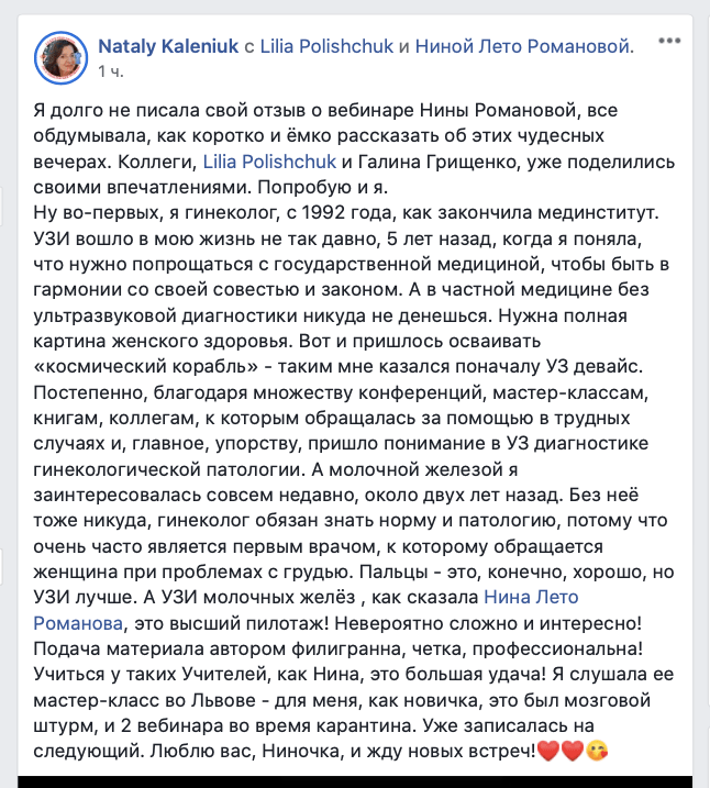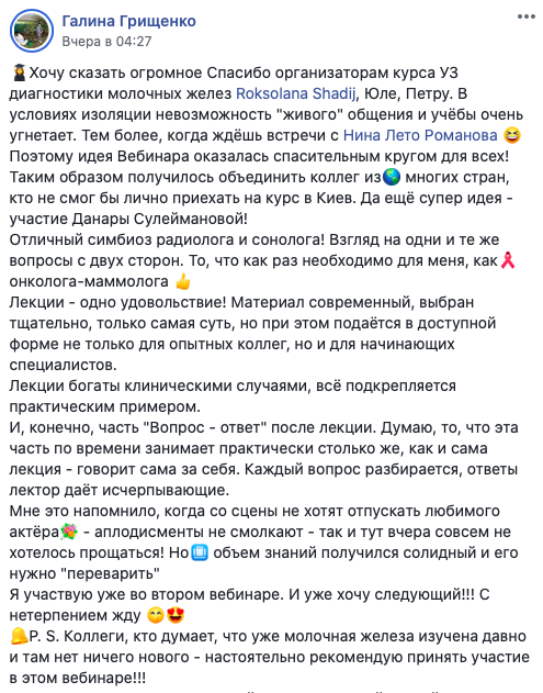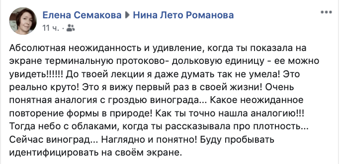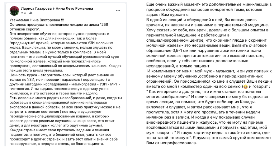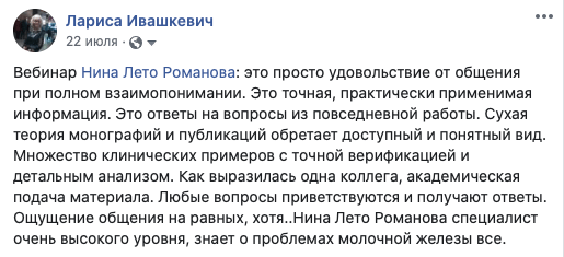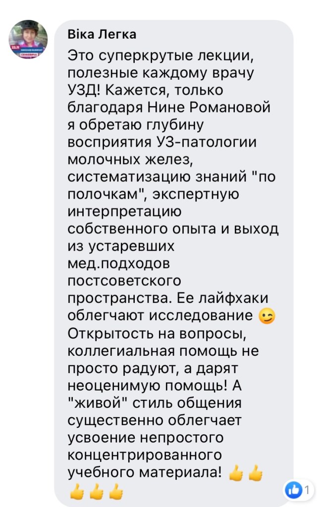 Про весь курс говорить не буду, остановлюсь на новой лекции по неинвазивным карциномам. Материал – революционный, и подача этого материала такая тонкая, что ты сам в процессе понимаешь, все это так и только так, и немного досадуешь на себя, что ж я сам то не догадался. В этом и состоит педагогический талант нашей коллеги. Сначала пройти путь самой, досконально разобраться с темой, вникнуть во все тонкости, до деталей продумать подачу этого сложного материала, и вот мы уже прошли весь путь, и он даже не показался нам сколько нибудь трудным. Так всегда бывает, когда повезло с учителем. Нам – повезло.